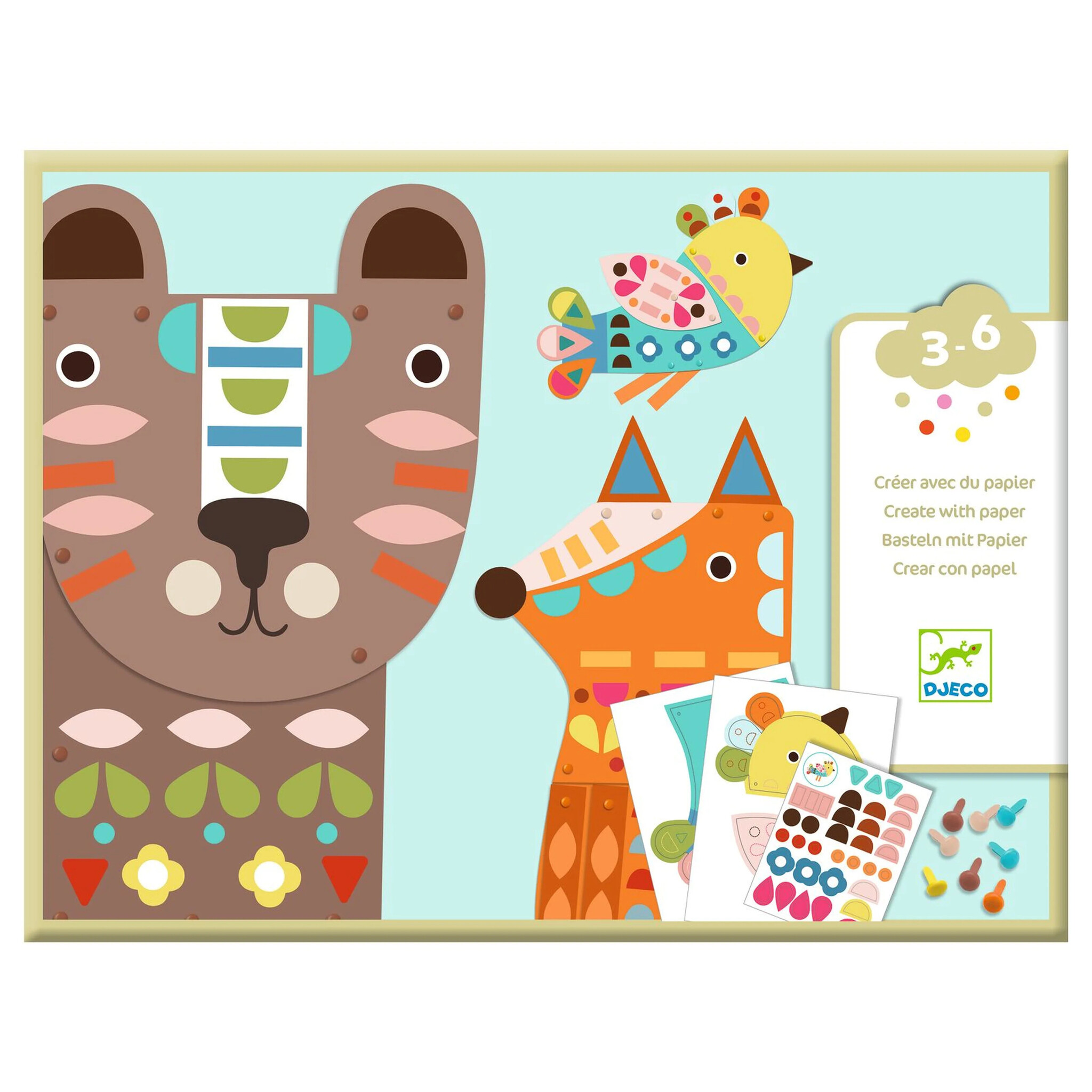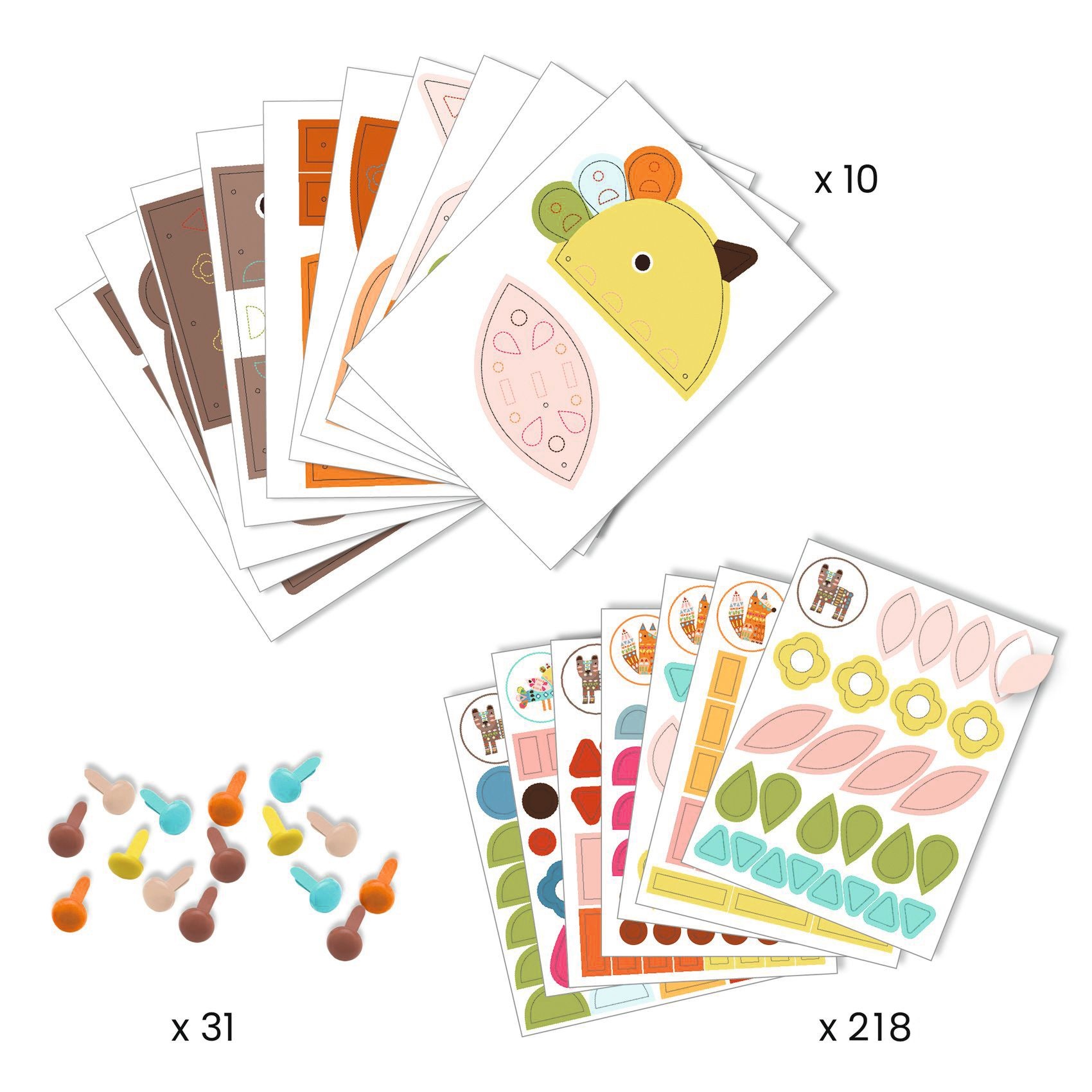 Een plakdoos om drie grote personages te versieren, in elkaar te zetten en in te kleuren. Aan de hand van de modellen in het boekje plakt het kind de stickers om de dieren af te maken. Daarna zet hij/zij ze met de splitpennen in elkaar om de volgende dieren te vormen: een beer (50 cm), een vos (40 cm) en een vogel (28 cm)!