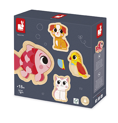 De puzzels bevatten alle dieren waar peuters dol op zijn: een vis uit 2 stukjes, een hond uit 3 stukjes, een papegaai uit 4 stukjes en een kat uit 5 stukjes.