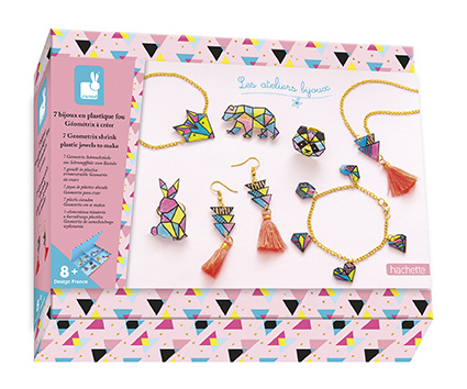 Met deze originele activiteit kunnen kinderen vanaf 8 jaar (met de hulp van een volwassene) 7 sieraden met zeer trendy geometrische vormen maken, met behulp van de gekke plastic techniek: 2 armbanden, een paar oorbellen, een salir, 2 ringen en een broche.