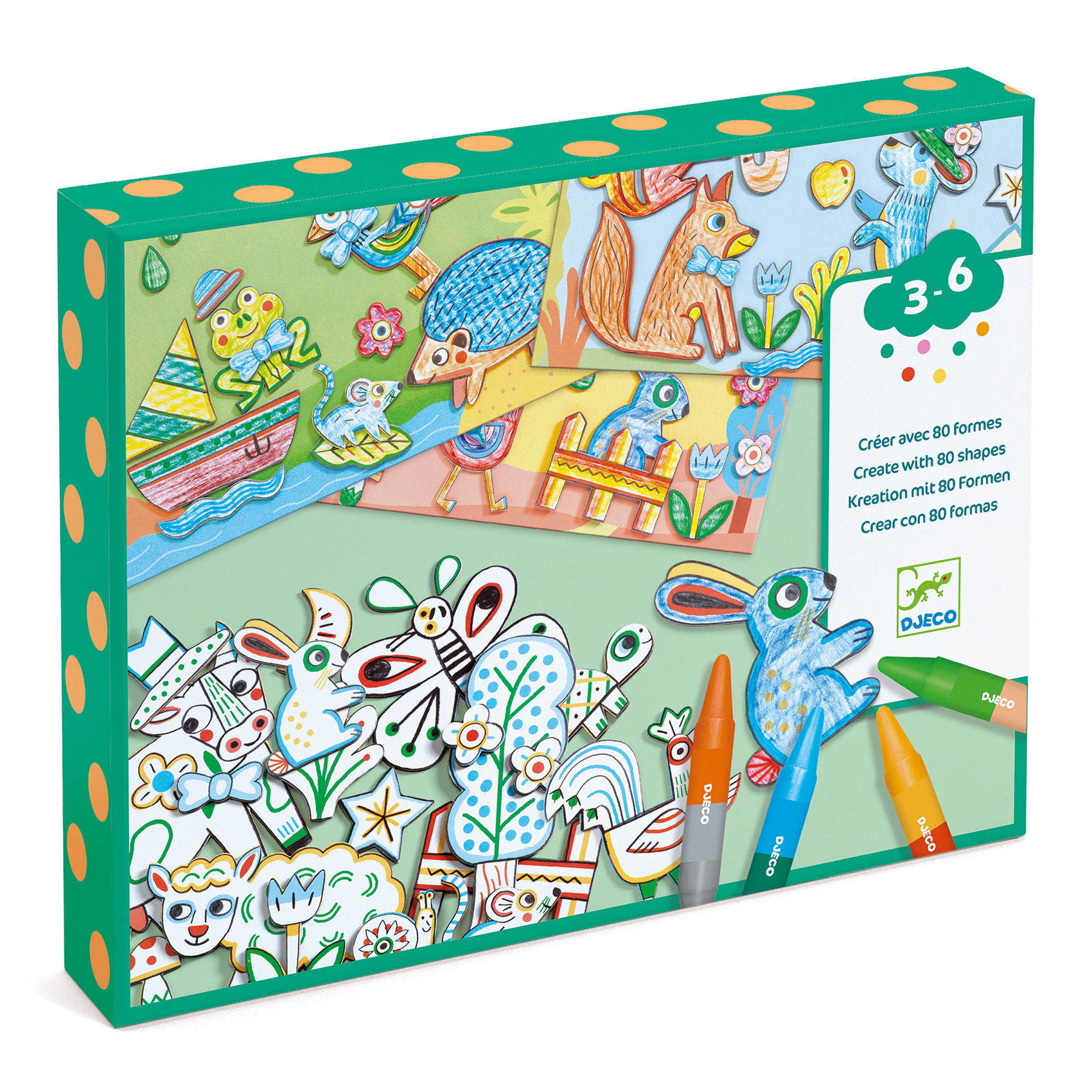 Een creatieve doos met dieren als thema. Een veelheid van dikke kartonnen vormen om te kleuren en op de 6 grote kleurplaten te plakken. Het stap-voor-stap instructieboekje geeft de kinderen een paar voorbeelden.