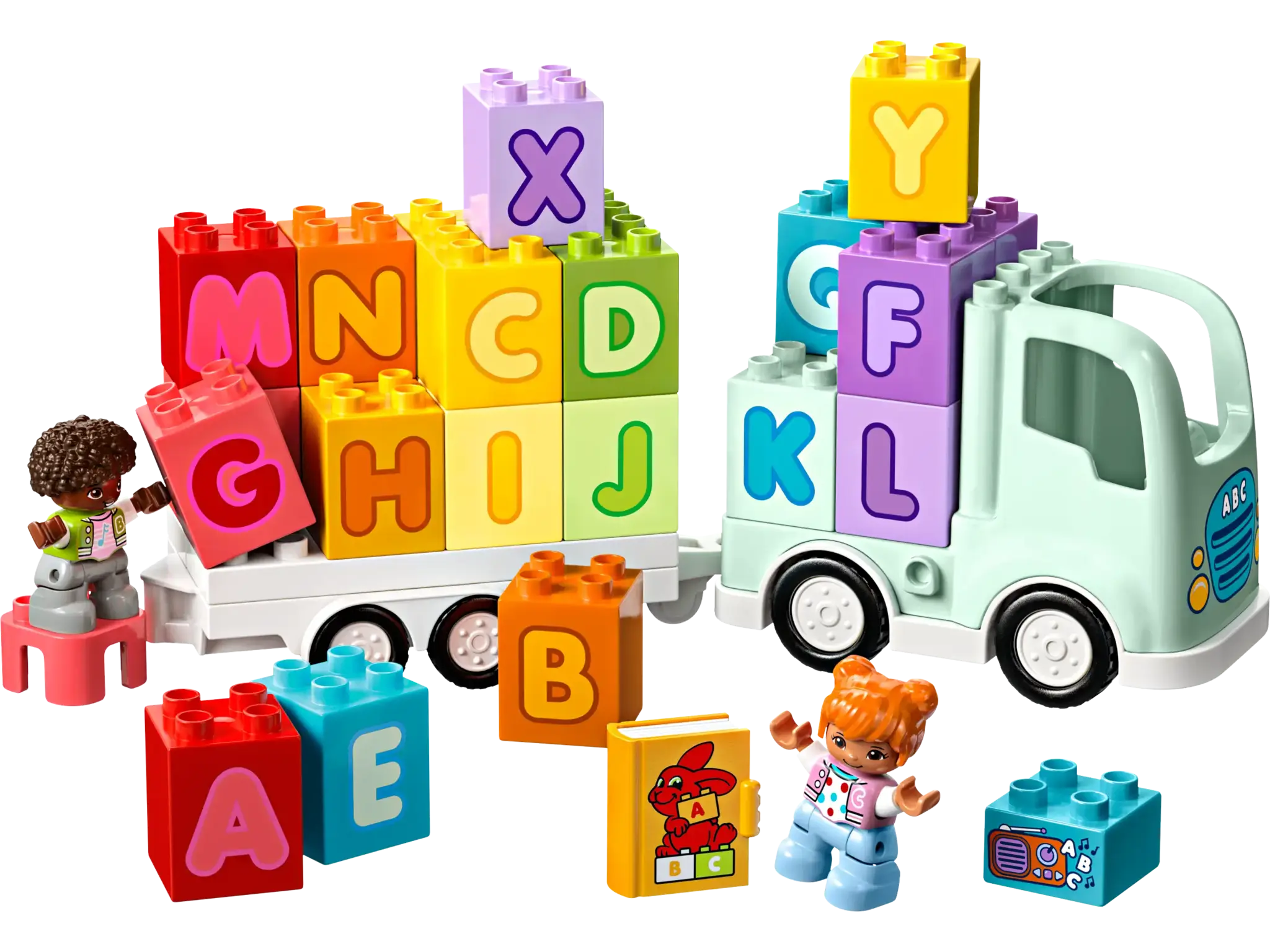 Fantasierijke accessoires zijn onder andere een LEGO DUPLO boekelement en een stereo-element om leuke ABC-meezingers met ouders en peuters aan te moedigen. Dit educatieve speelgoed stimuleert peuters om creatieve verhalen te verzinnen terwijl ze in de cabine van hun speelgoedvrachtwagen klimmen en op weg gaan naar een nieuw avontuur!