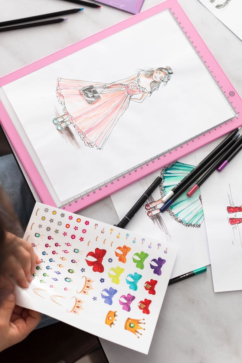 Een echte stylingworkshop om trendy outfits te creëren. Dankzij de lichte plank en de vele accessoires kan uw kind outfits creëren, tekenen en aanpassen als een echte stylist