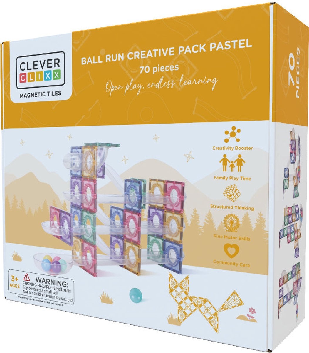 Deze ball run in pastelkleuren van Cleverclixx bevat 70 stuks. Met deze set kan je meteen een mooie start maken om te beginnen bouwen met onze magnetische tegels. Magneten hebben iets magisch en spreken bij kinderen sowieso tot de verbeelding. De creativiteit & fantasie van je kind is helemaal vrij bij het bedenken van leuke constructies en ideeën om te spelen met je favoriete Cleverclixx set. Alle sets zijn compatibel met elkaar dus je kan altijd uitbreiden.