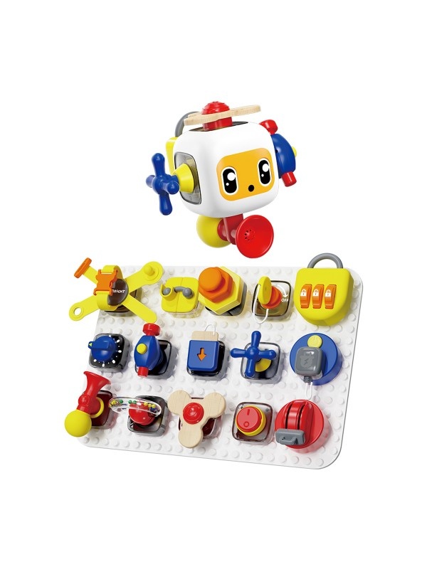 De leuke set bestaat uit een kleine kubus, een ophangbord en 15 spannende gadgets die ouders en kinderen op de kubus of het bord kunnen plakken. Of het nu gaat om verschillende sloten om uit te kiezen, een grappige claxon of verschillende knoppen om in te drukken of te draaien - er is genoeg om vast te pakken, vast te houden en te ontdekken! Tegelijkertijd trainen kinderen spelenderwijs hun fijne motoriek, oog-handcoördinatie, concentratie en logisch denken. Bovendien worden ze creatief en combineren ze de ontdekkingselementen keer op keer op het bord of de kubus. De schattige kubus heeft bovendien een handig formaat en is daarom ook ideaal voor lange trein- of autoreizen - vervelen is er zeker niet!
