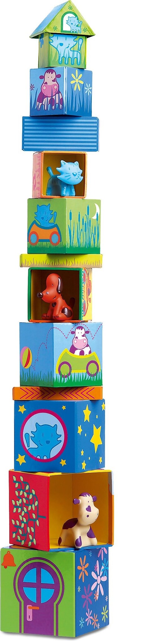 Stapelspel met 14 kartonnen blokken uit hard karton en 3 grappige diertjes.