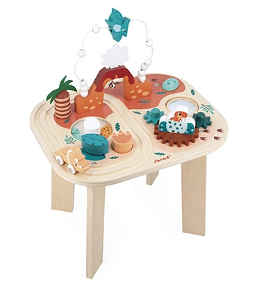 Een vulkaan, mysterieuze eieren: ongetwijfeld zijn de dino's de sterren van deze activiteitentafel van Janod! Er is zoveel te ontdekken: een telraam met kralen, bewegende elementen, een rinkelend belletje enz.