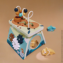 Deze activiteitenkubus in de vorm van een Dino vulkaan is een super leuke speelkubus met verschillende uitdagende activiteiten voor kinderen vanaf 1 jaar. Een vormenstoof met houten dino blokken om op de juiste plaats te steken, aan de binnenkant zit vilt, dus de blokken vallen zacht. Een spiegel om dat nieuwe gezicht te ontdekken, tandwielen om aan te draaien en bovenop een doolhof en een telraam met houten kralen. Dit prachtige activiteitenspel is gemaakt om de behendigheid van peuters te bevorderen.