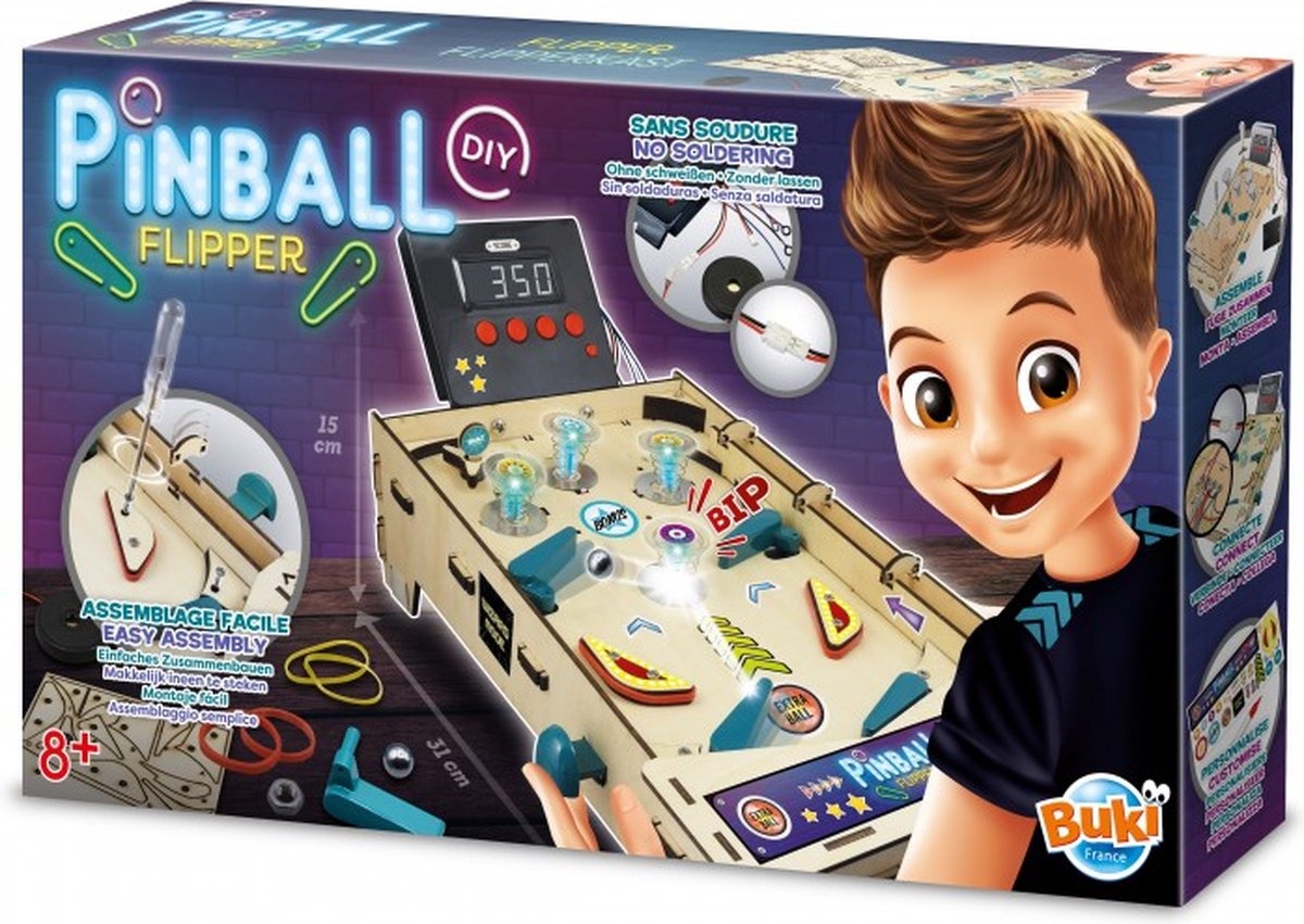 Monteer je flipperkast met de elementen uit het pakket. Gebruik hiervoor de schroevendraaier die ook in het pakket zit. Sluit de componenten aan op de verbindingsstukken zonder laswerk: bumpers, lichtdiodes en het scorebord. Personaliseer je flipperkast met de stickers.