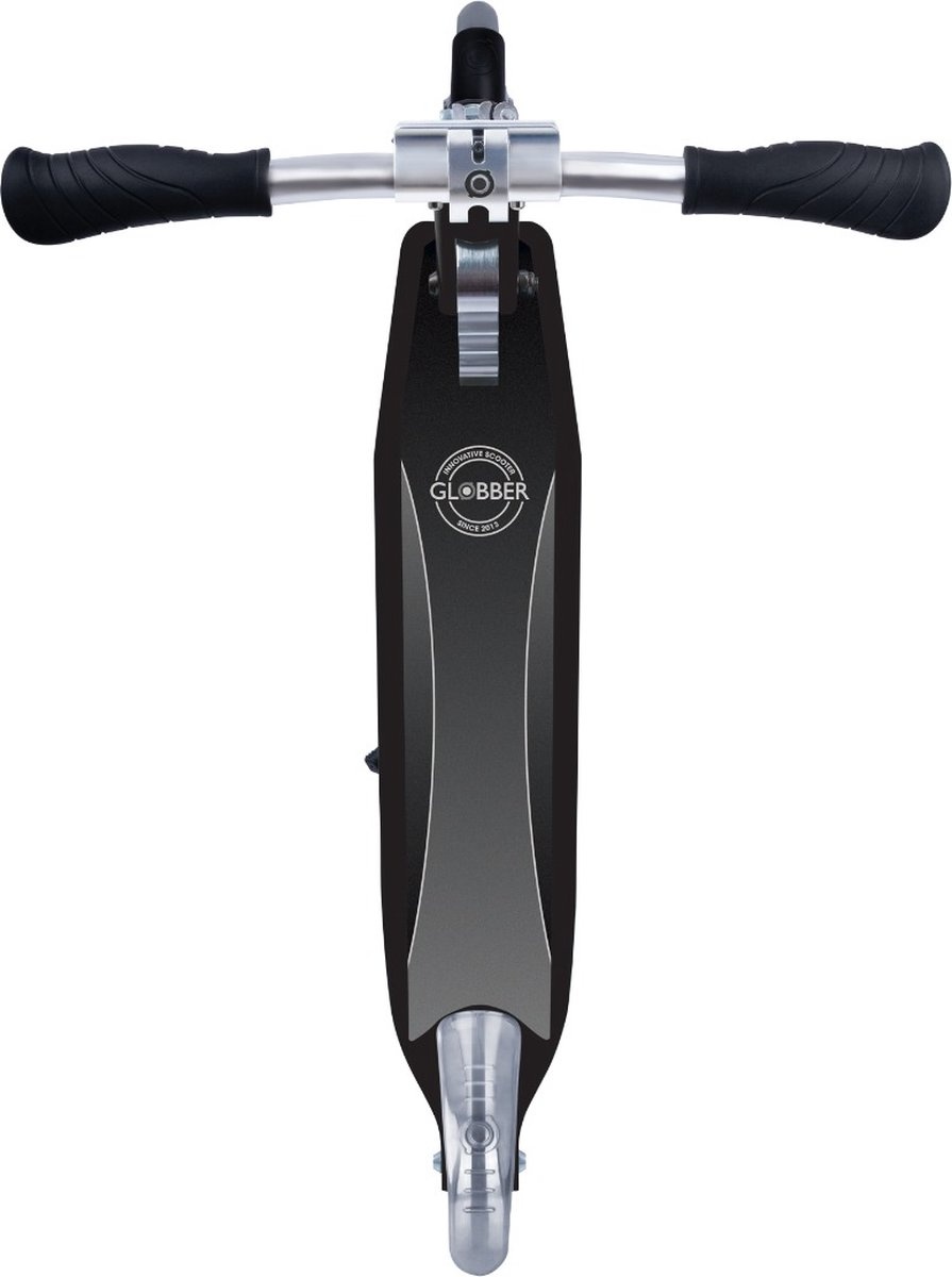 De dubbele clamp boven de voorvork zorgt voor een uitermate sterke montage. Het risico van speling is hier minimaal. Deze kanjer is gemaakt van aluminium en bijgevolg vederlicht. Het deck, dat is voorzien van een anti-slip griptape met Globber logo, heeft een draagkracht tot 100 kg.