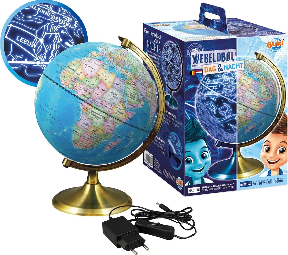 Een wereldbol van 21 cm voor het observeren van de aarde overdag en de sterrenbeelden 's nachts. Druk in het donker op de schakelaar om de nachtfunctie te activeren.