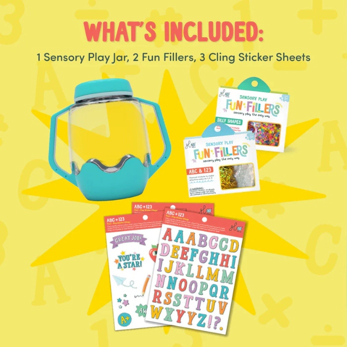 De blauwe Sensory Play Jar licht zacht op in negen kleuren en verandert van tint met één tikje – een betoverend effect dat elk kind zal fascineren. De set bevat daarnaast twee zakjes Fun Fillers met het thema ABC & 123 en Silly Shapes, vol leerzame en tactiele elementen om te verkennen. De drie vellen herbruikbare stickers met letters en cijfers maken het spel compleet en zorgen voor eindeloos personaliseerplezier.
