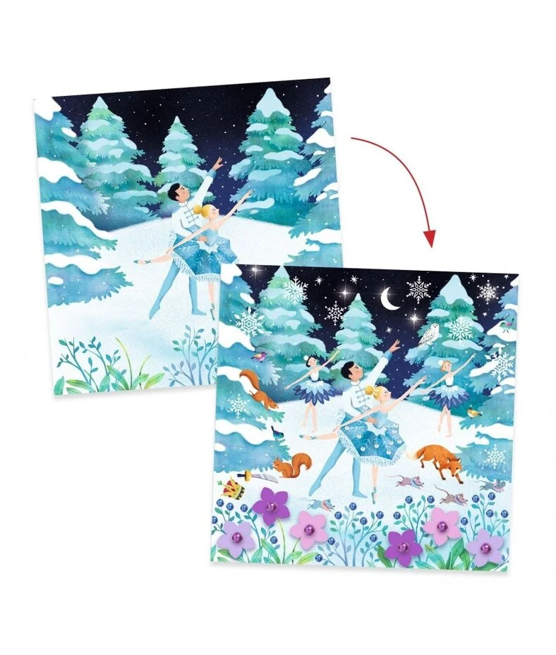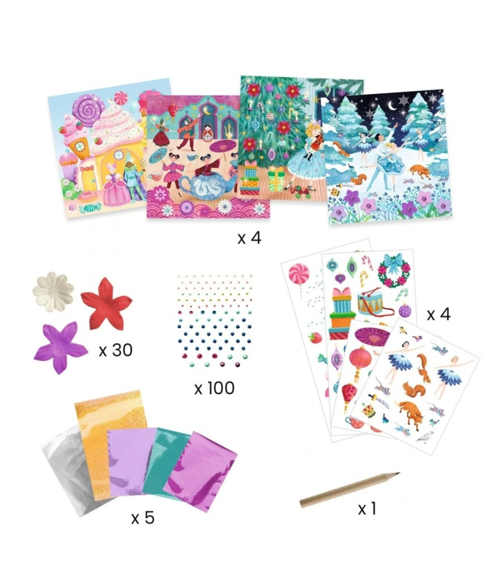 Het kind versiert elk schilderij met stickers, papieren bloemen, zelfklevende strass-steentjes en metaalpatronen.