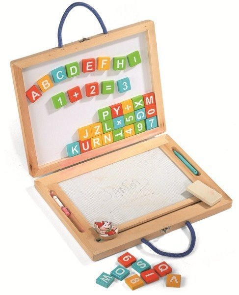 Heb je een lange reis voor de boeg? Dit bord is de ideale activiteit om de kinderen bezig te houden! Met deze multi-activiteitenkoffer kun je urenlang plezier hebben! Kinderen vanaf 3 jaar kunnen schrijven, lezen, tellen en ook tekenen! Deze koffer bevat een magische lei met een stift om gemakkelijk te wissen, een magnetische kant met magneten voor letters, cijfers en tekens, een zwarte lei met krijt en een penseel en een witte lei om te schrijven met een uitwisbare markeerstift (niet meegeleverd).