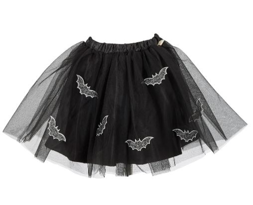 Een mooie aanvulling op je heksen-outfit is dit zwarte rokje genaamd Mathilde. Het mooie rokje heeft een verstelbaar elastiek in de taille, een tule bovenrokken, satijnen onderrok en griezelig mooie vleermuizen met glitters.
