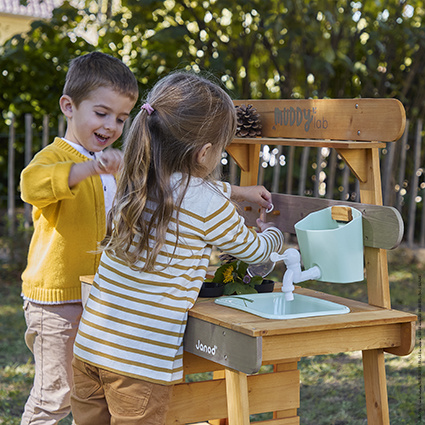 Met dit Muddy Lab buiten keukentje van Janod wordt buiten koken in open lucht een hele ervaring! Laat de fantasie in actie komen en bereid de heerlijkste gerechten met een beetje aarde, een paar grassprieten, water, mooie bloemen, ... Super leuk om mee te spelen, te mengen, te experimenteren, te ontdekken en te observeren! Deze buitenkeuken voor kinderen is multifunctioneel buitenspeelgoed. Zo maak je er een buitenwerktafel van of een oppottafel, een echt natuurontdekkingslaboratorium. Dit speelkeukentje voor buiten kan het allemaal aan, het werd speciaal behandeld om buiten te gebruiken.