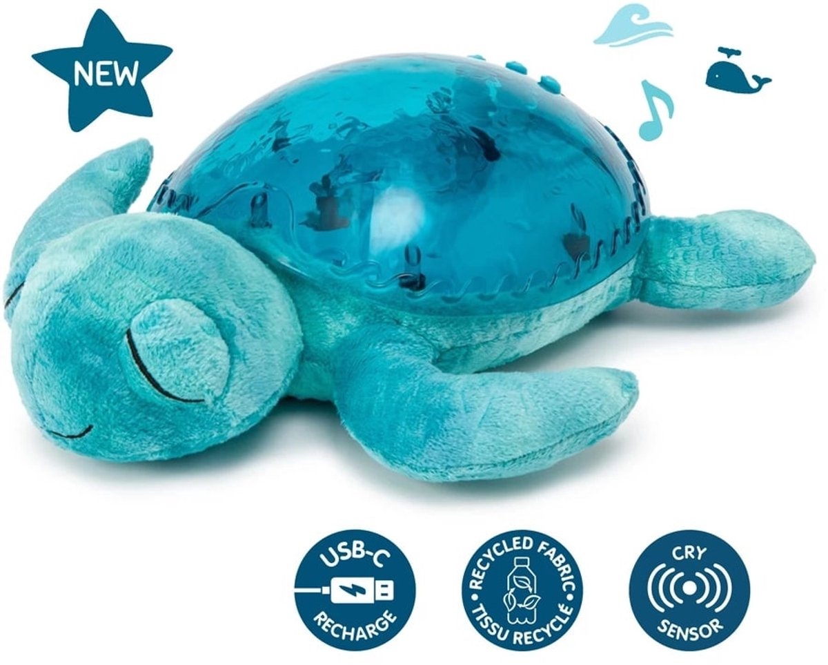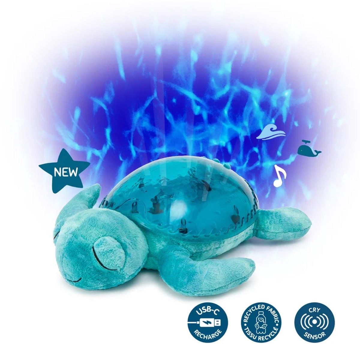Prachtige Tranquil Turtle Aqua Schildpad Muzikale Babyprojector Oplaadbaar van Cloud B. Een mooi kalmerende knuffelschildpad in blauw/groen. Deze muzikale projector van Cloud B is perfect voor op de slaapkamer van je kleine. Met de combinatie licht, kleur, geluid, vormen en beweging helpt de babyprojector je kindje rustig te worden na een drukke dag.