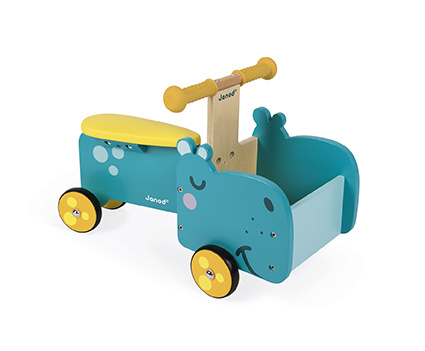 Deze grappige houten loopfiets in de vorm van een nijlpaard heeft een ruime bak zodat je kind een heleboel schatten kan vervoeren. De ergonomische handgrepen zorgen voor een optimale grip voor de kleine handjes van kinderen. De rubberen banden rond de vier wielen maken geen strepen op de vloer, zorgen voor een betere grip zodat de wagen niet te snel gaat en dempen het geluid.