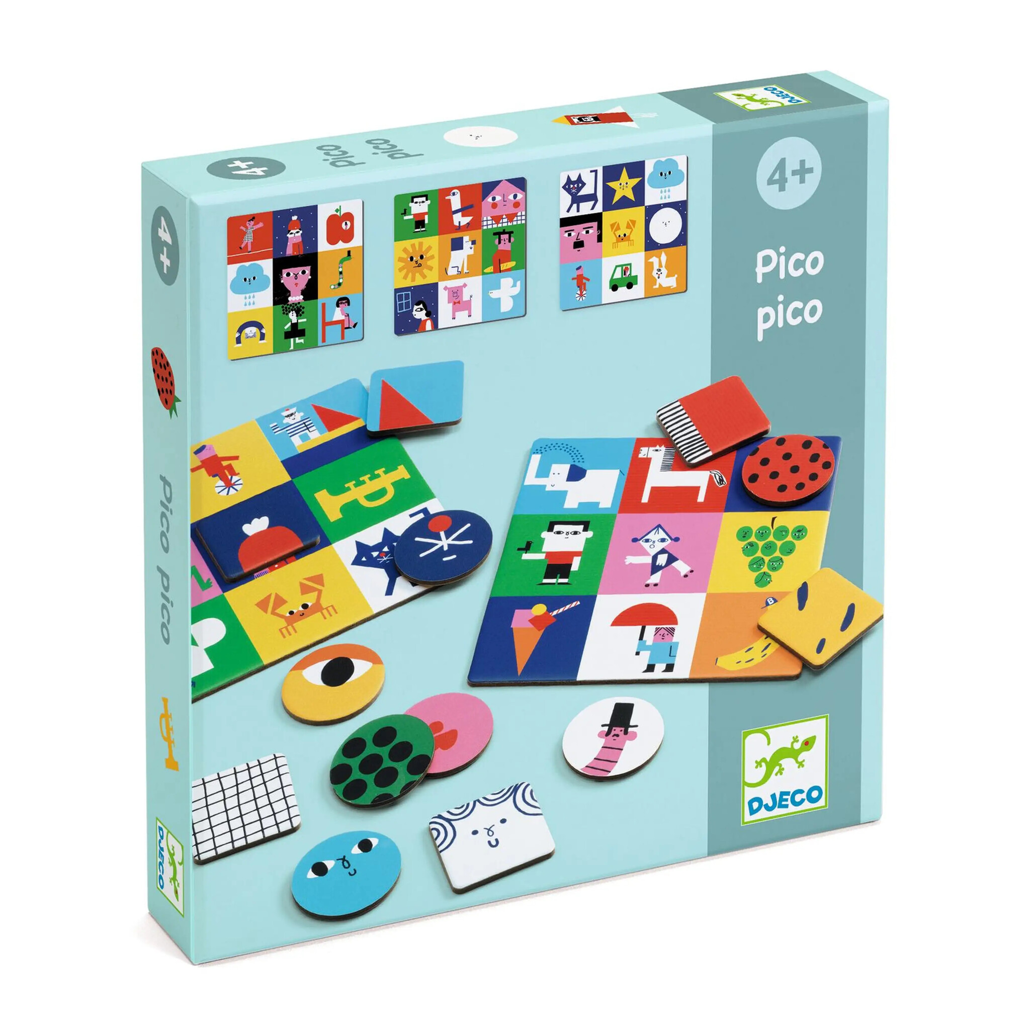 Djeco Pico Pico is een lottospel, een klassieker, die in een nieuw jasje gestoken is met als thema vormen en motieven. Een mooi spel dat het waarnemingsvermogen ontwikkelt.