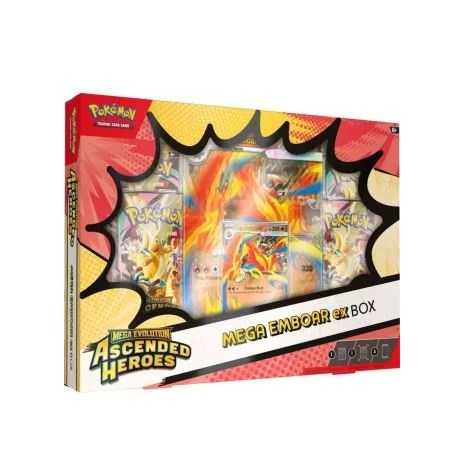 De Pokémon Mega Evolution - Ascended Heroes - Mega Emboar ex Box is een officiële speciale box van Pokémon met een foil promokaart, een oversized lenticulaire kaart en 4 boosterpacks uit Mega Evolution—Ascended Heroes.