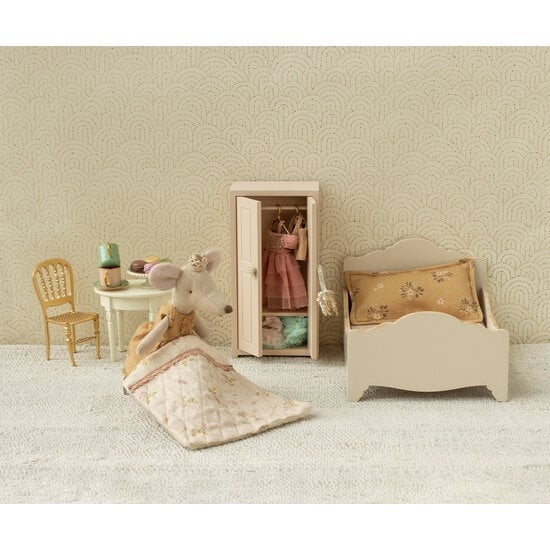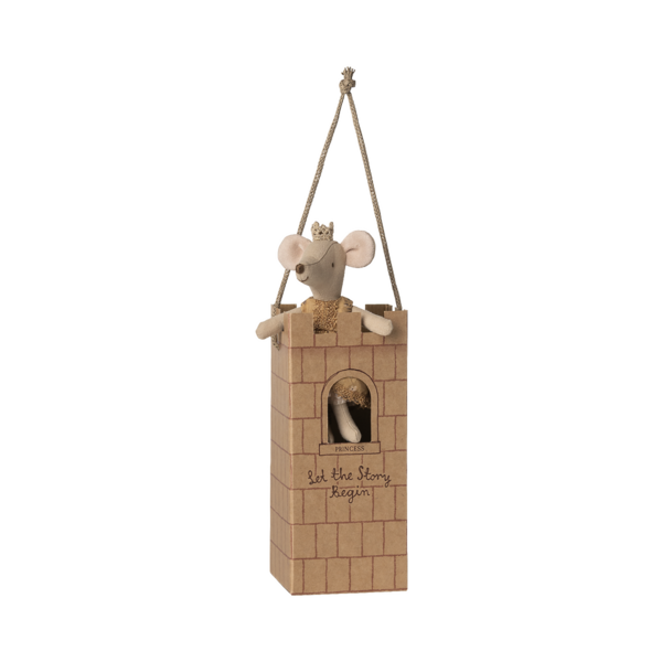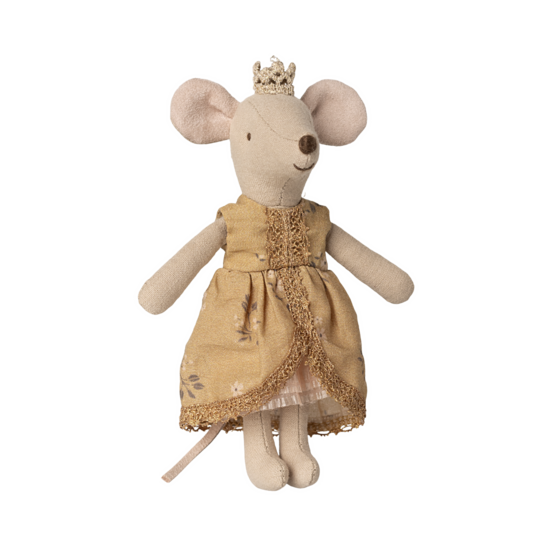 Een echte prinsessenmuis in grote zus-formaat. Ze is gekleed in haar mooiste jurk met prachtige details en een gouden kroon. Ze past perfect in het Maileg-kasteel.