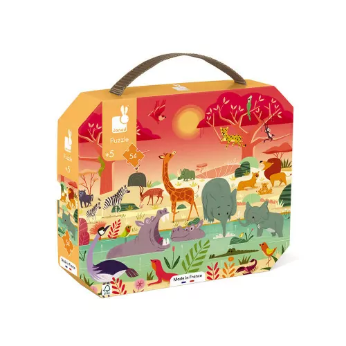 Neem de kinderen mee op een natuursafari terwijl de zon ondergaat boven de Afrikaanse vlaktes! Dat is de exotische belofte van deze prachtige 54-delige kartonnen puzzel, met zijn vele details en warme kleuren. De rust van de savanne en de vele afgebeelde dieren nodigen uit om te ontsnappen! Ontwikkel je geheugen en behendigheid met deze prachtige 54-delige kartonnen puzzel. Verpakt in een mooie koffer is de puzzel gemakkelijk mee te nemen dankzij het stoffen handvat. Er zit een poster bij die beginners als voorbeeld kunnen gebruiken, zodat meer ervaren puzzelaars de puzzel zelf kunnen maken.