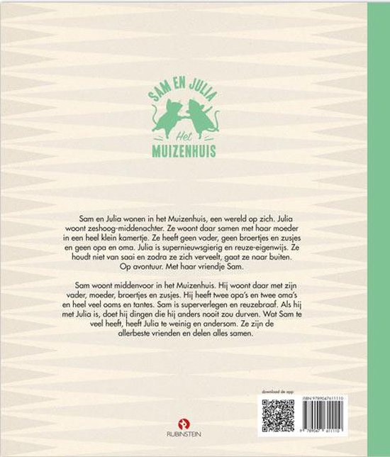 Sam en Julia wonen in het Muizenhuis, een wereld op zich. Julia woont zeshoog-middenachter in een piepklein kamertje met haar moeder. Ze heeft geen vader, geen broertjes en zusjes en geen opa en oma. Julia is supernieuwsgierig en reuze-eigenwijs en ze laat geen kans op avontuur onbenut. En dat doet ze graag met haar vriendje Sam. Sam woont middenvoor in het Muizenhuis samen met zijn vader, moeder, broertjes en zusjes. Hij heeft twee opa's, twee oma's, en twee ooms en tantes. Sam is superverlegen en reuzebraaf, maar in het gezelschap van Julia waagt hij zich aan avonturen die hij anders nooit zou aandurven. Samen vormen ze een onafscheidelijk duo. 'Het Muizenhuis - Sam en Julia' is een tijdloos verhaal dat absoluut niet mag ontbreken in de boekenkast van elk kind.