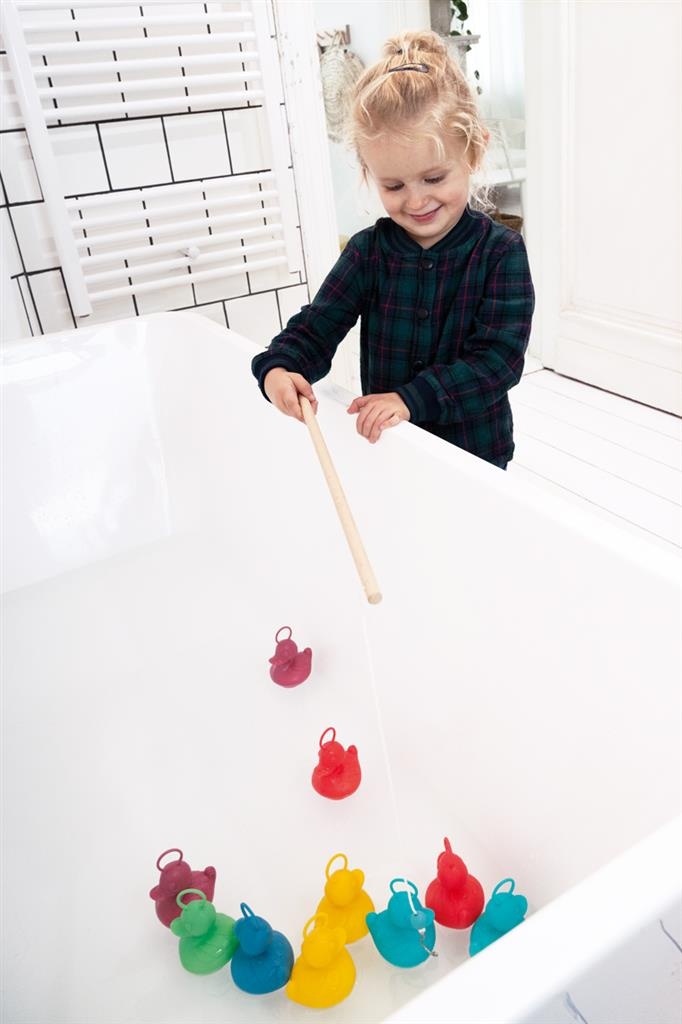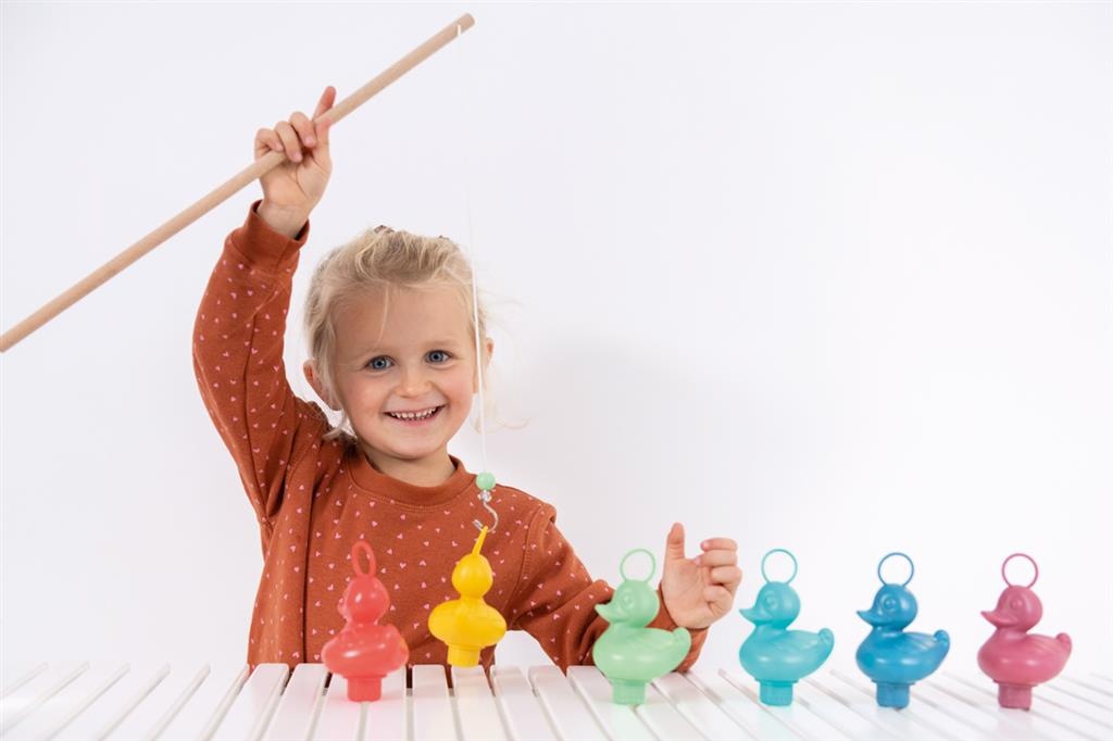 Uren visplezier, binnen of buiten, in bad of op het droge. Leer de kinderen kleuren herkennen door ze een bepaalde kleur te laten vissen. Je kan met een waterproof stift de eendjes onderaan punten geven om het spel compleet te maken. Set van 6 kermiseendjes en 2 hengels. De enorm populaire kermiseendjes zijn er nu ook in hippe en zachte koraalkleurtjes. De moderne en trendy verpakking maakt deze set een super cadeau om te geven.