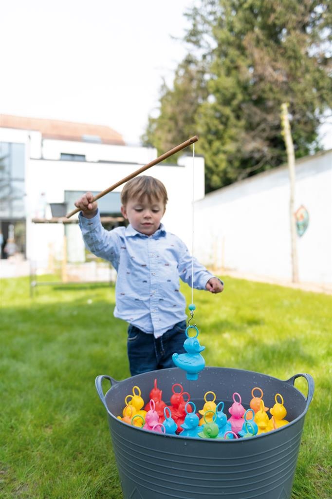 Uren visplezier, binnen of buiten, in bad of op het droge. Leer de kinderen kleuren herkennen door ze een bepaalde kleur te laten vissen. Je kan met een waterproof stift de eendjes onderaan punten geven om het spel compleet te maken. Set van 6 kermiseendjes en 2 hengels. De enorm populaire kermiseendjes zijn er nu ook in hippe en zachte koraalkleurtjes. De moderne en trendy verpakking maakt deze set een super cadeau om te geven.
