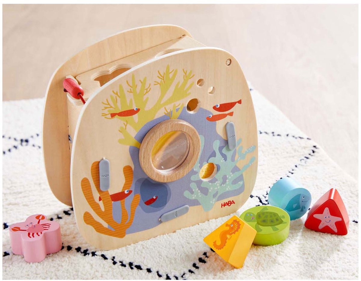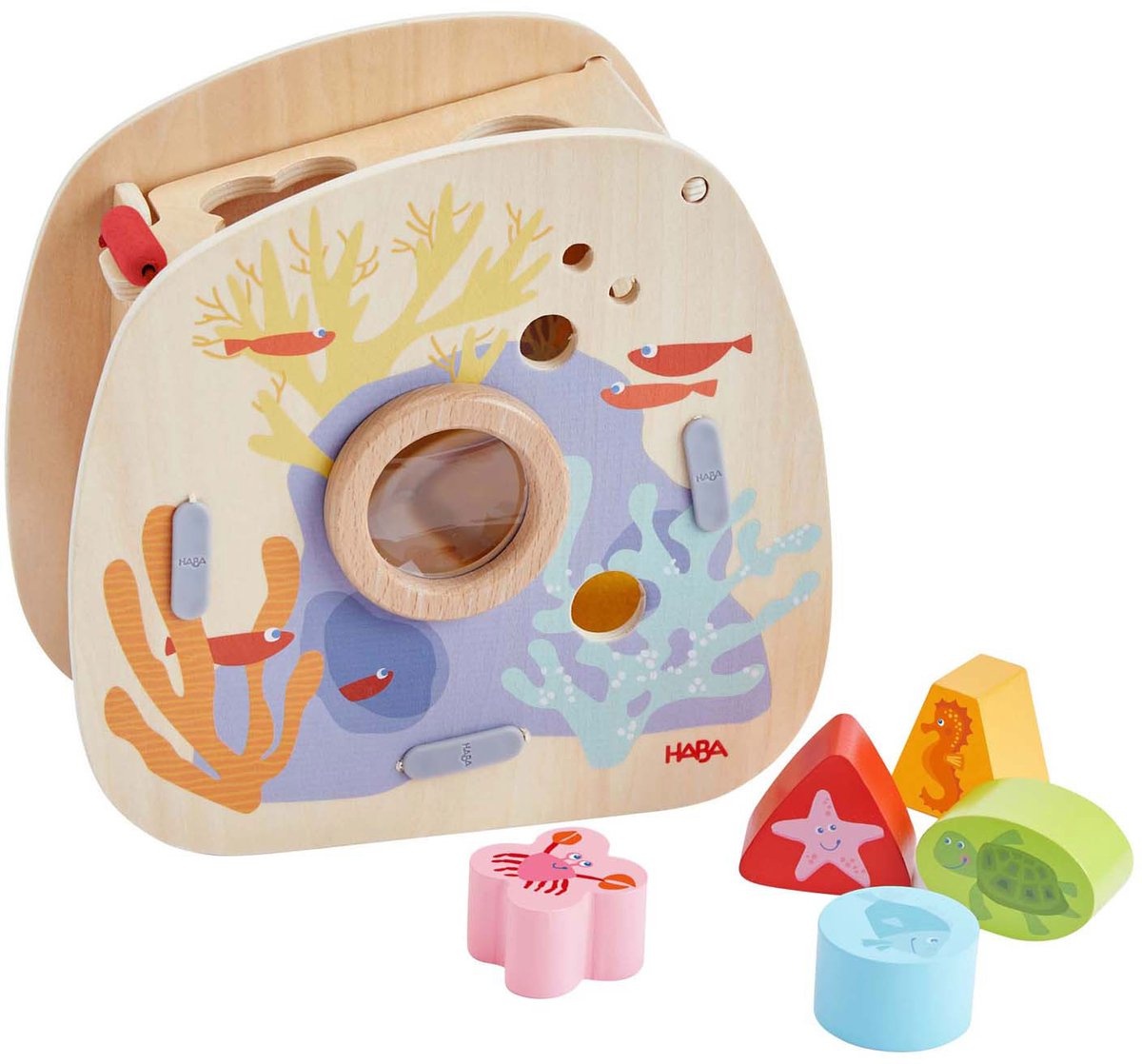 Neem een duik onder water ... De sorteerblokken hebben de vormen van verschillende zeedieren en voor ieder dier is er maar één juiste ingang. Welke dat is, zoeken kinderen uit door te proberen en goed te kijken. Helemaal fantastisch: via een 'patrijspoort' kunnen ze de kleurrijke onderwaterwereld ontdekken. Met eenvoudig te openen klep.