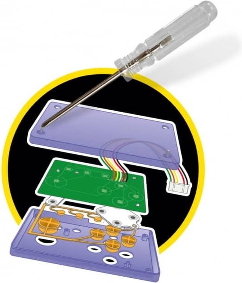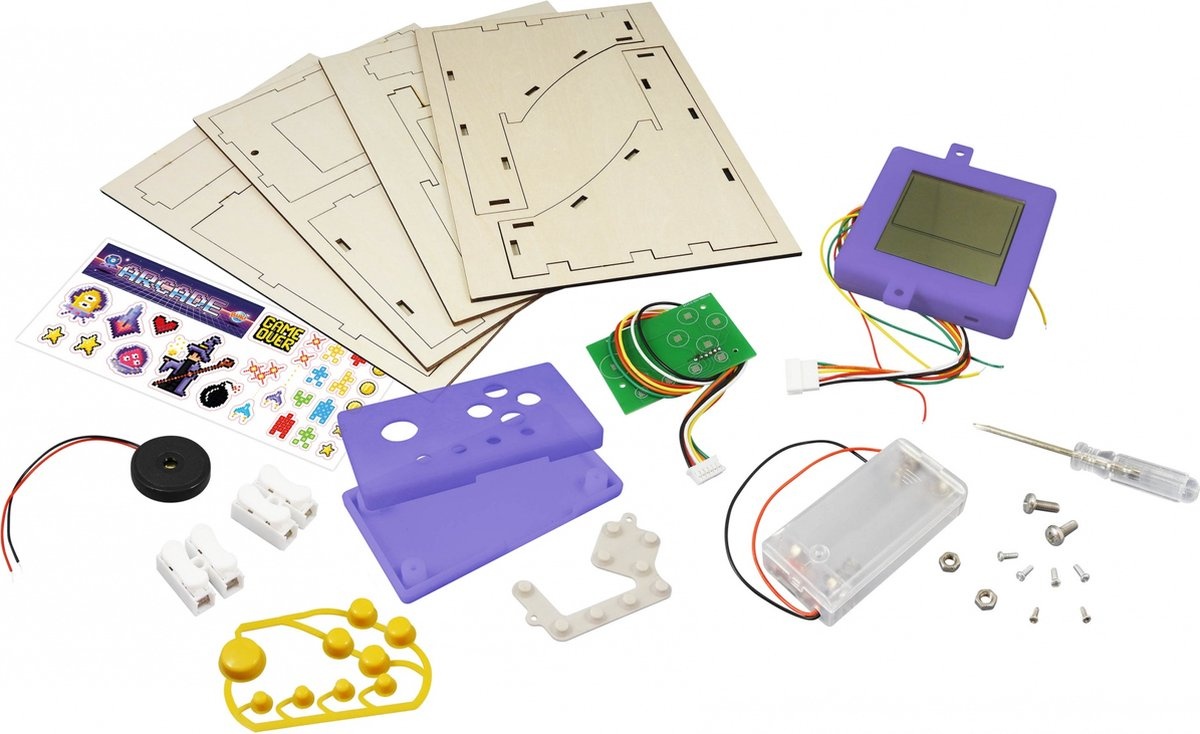 Gebruik de meegeleverde schroevendraaier om de controller in elkaar te zetten, de kast te bouwen en de componenten aan te sluiten: scherm, luidspreker en voeding. Met de meegeleverde stickers kan je de kast personaliseren en opleuken.