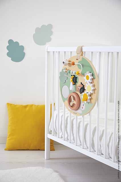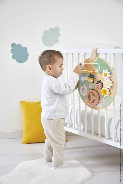 Een heleboel activiteiten binnen handbereik! Met dit houten activiteitenpaneel kunnen baby's vanaf 12 maanden veel plezier beleven. Dit speelgoed is ontworpen om het gehoor, het zicht, de tastzin en de fijne motoriek te stimuleren en belooft lange speel- en ontdekkingsmomenten! In totaal zijn er 7 activiteiten beschikbaar voor baby: 3 tandwielen in de vorm van een bloem om te draaien met behulp van een handvat of de bloemblaadjes, 1 bij die geluid maakt als hij wordt gedraaid, 1 lieveheersbeestje dat aan en uit kan worden geschroefd, 1 telraam in de vorm van een rups om steeds opnieuw rond te schuiven, 3 spiegels om zichzelf te observeren, 1 slak waarvan het schild draait en de gekleurde kralen binnenin geluid maakt, 1 zacht vilten vel dat kan worden versteld om een vervormende spiegel te onthullen die gewoon te leuk is. Alle activiteiten in dit peuterspeelgoed zijn zo ontworpen dat baby kan experimenteren en ontdekken door ermee te spelen. Op de leeftijd van 1 jaar leren ze door aan te raken en te observeren begrijpen hoe hun omgeving werkt. Het andere leuke aan dit baby-activiteitenbord is dat het modulair is, zodat het kan worden aangepast aan de speelhouding van je kind. Het kan bijvoorbeeld aan de muur of aan de spijlen van de box worden gehangen met behulp van de klittenbandsluiting aan de bovenkant.