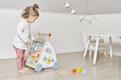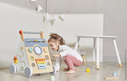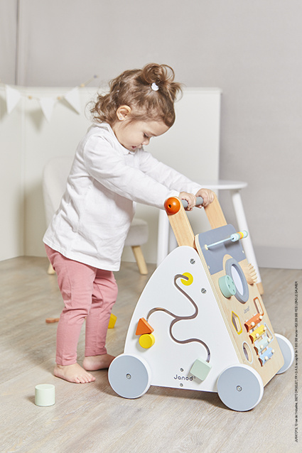 Deze mooie voortduwbare multifunctionele loopkar is bijzonder geschikt om te leren lopen. Het zal uw kind vanaf 12 maanden in alle veiligheid begeleiden: dankzij de onzichtbare en verwijderbare rem kunnen de wielen worden vergrendeld en geleidelijk worden losgemaakt om de snelheid van de trolley tijdens het leren te regelen. Naast het lopen kan uw kind zijn fijne motoriek en zijn behendigheid testen met de 9 leuke activiteiten die worden aangeboden: telraam, vormdoos, doolhof, tandwielen, geluidsdraaiknop, "scratcher-scratcher", vergrotende roterende spiegel, trommel en metalen xylofoon om zijn muzikale ontwaken te ontwikkelen. Heel slim, het is uitgerust met een vilten mat om het geluid te verminderen en de val van de kubussen te dempen. Eindelijk zijn de wielen stil! Als we hieraan toevoegen, zijn eigentijdse design en zijn zachte kleuren, we kunnen alleen maar kraken! We houden van het natuurlijke hout, het wit en het grijs, geaccentueerd door de kleurrijke details van de vele activiteiten van deze peutertrolley voor baby's!