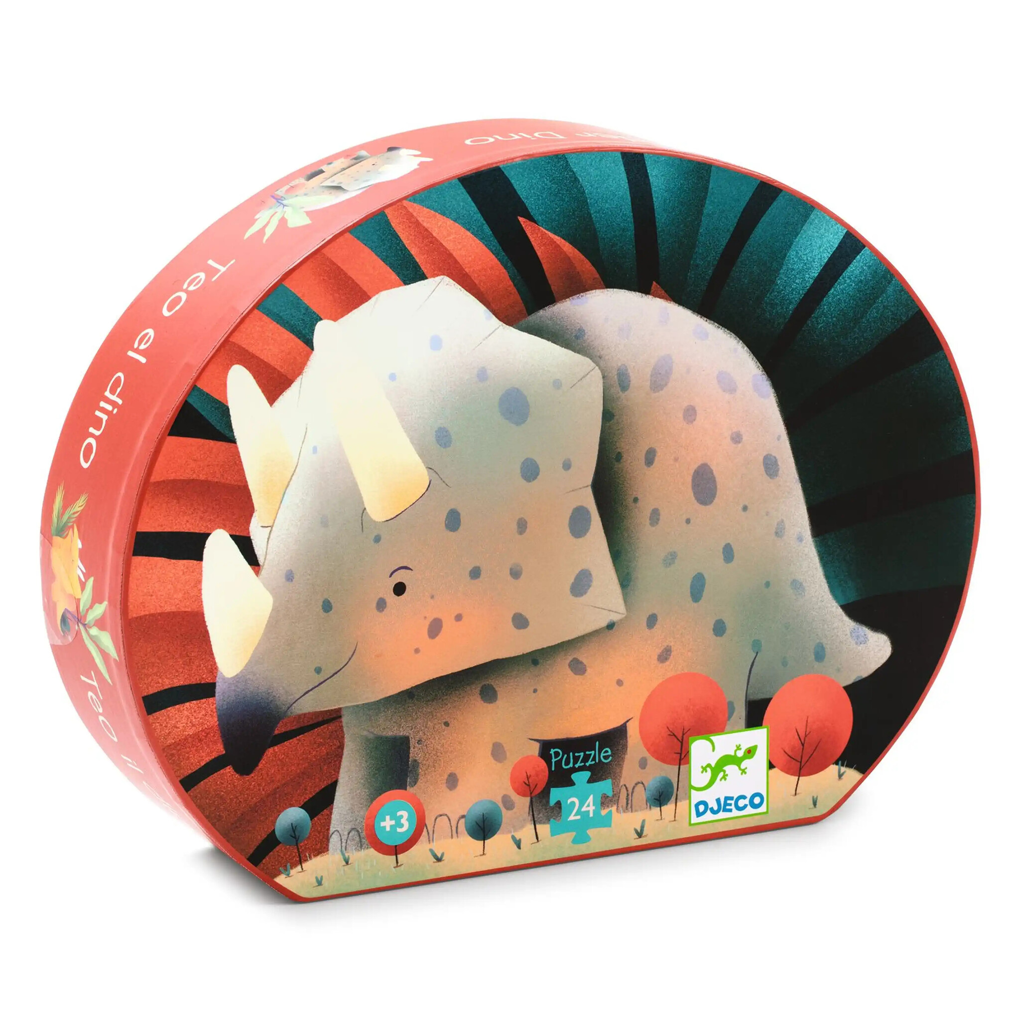 Téo de triceraptops en zijn kleintje kijken uit over de vlakte naar hun vriendjes. Een prachtige puzzel van 24 stukjes in een doos in de vorm van een dinosaurus.