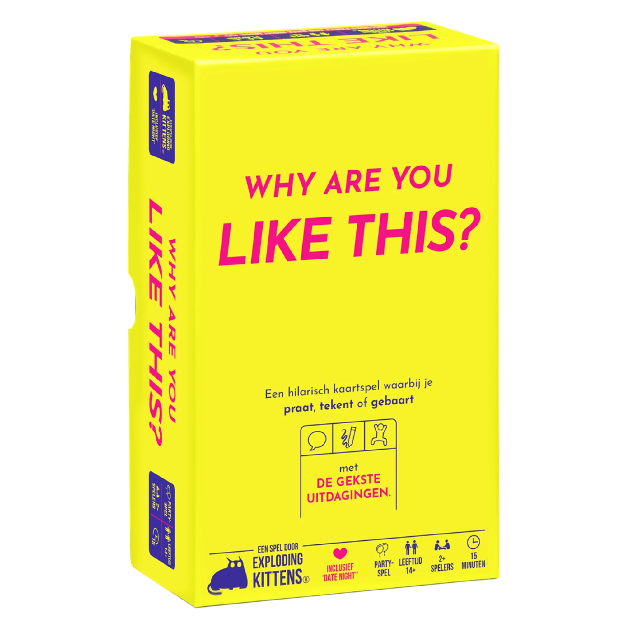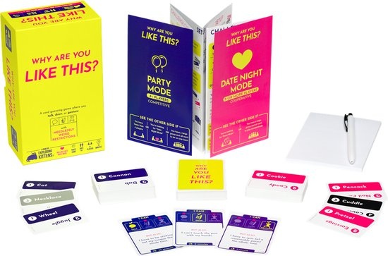 Het spel Why are you like this? haalt iedereen uit zijn comfortzone en is perfect voor feestjes, teambuildings en ludieke spelletjesavonden. Er is ook een Date Night-modus voor twee spelers, voor als je gek wil doen met je partner.