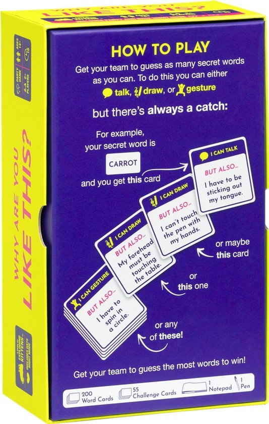 Dit partyspel speel je in teams. Laat je team zo veel mogelijk geheime woorden raden voordat de timer afgaat. Je mag praten, tekenen of gebaren maken. Elke kaart geeft een extra twist om het moeilijker en grappiger te maken.